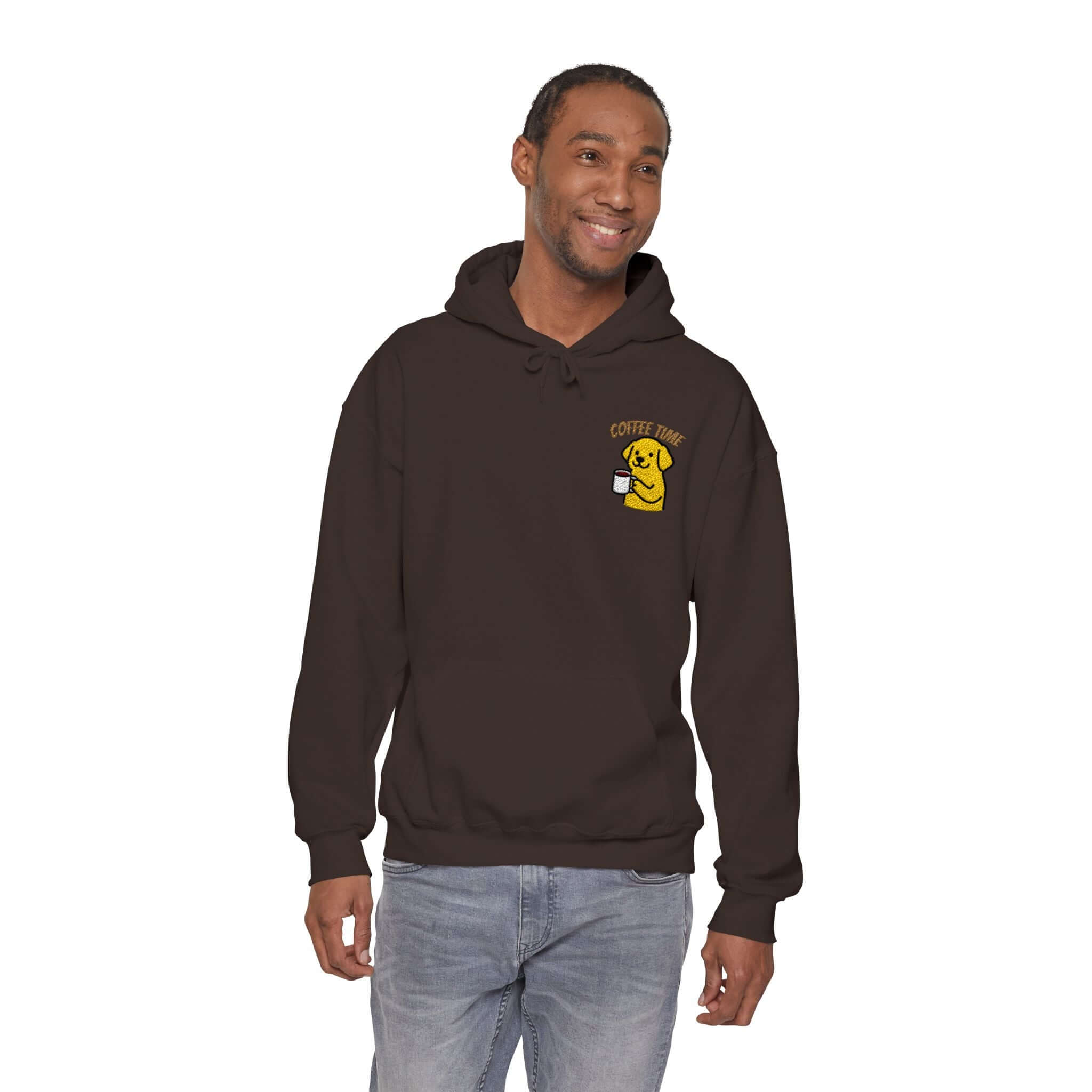 Indulge in slow mornings with our Coffee Time Dog Embroidered Unisex Hoodie Style 3. Made of 50/50 cotton-poly medium-heavy fabric, its soft, warm, and perfect for casual outings. This hoodie features a vintage-inspiredCoffee Timegraphic on the chest, a kangaroo pouch pocket, and a double-lined hood with color-matched drawcord for durability. Suitable for both relaxing at home or running quick errands.