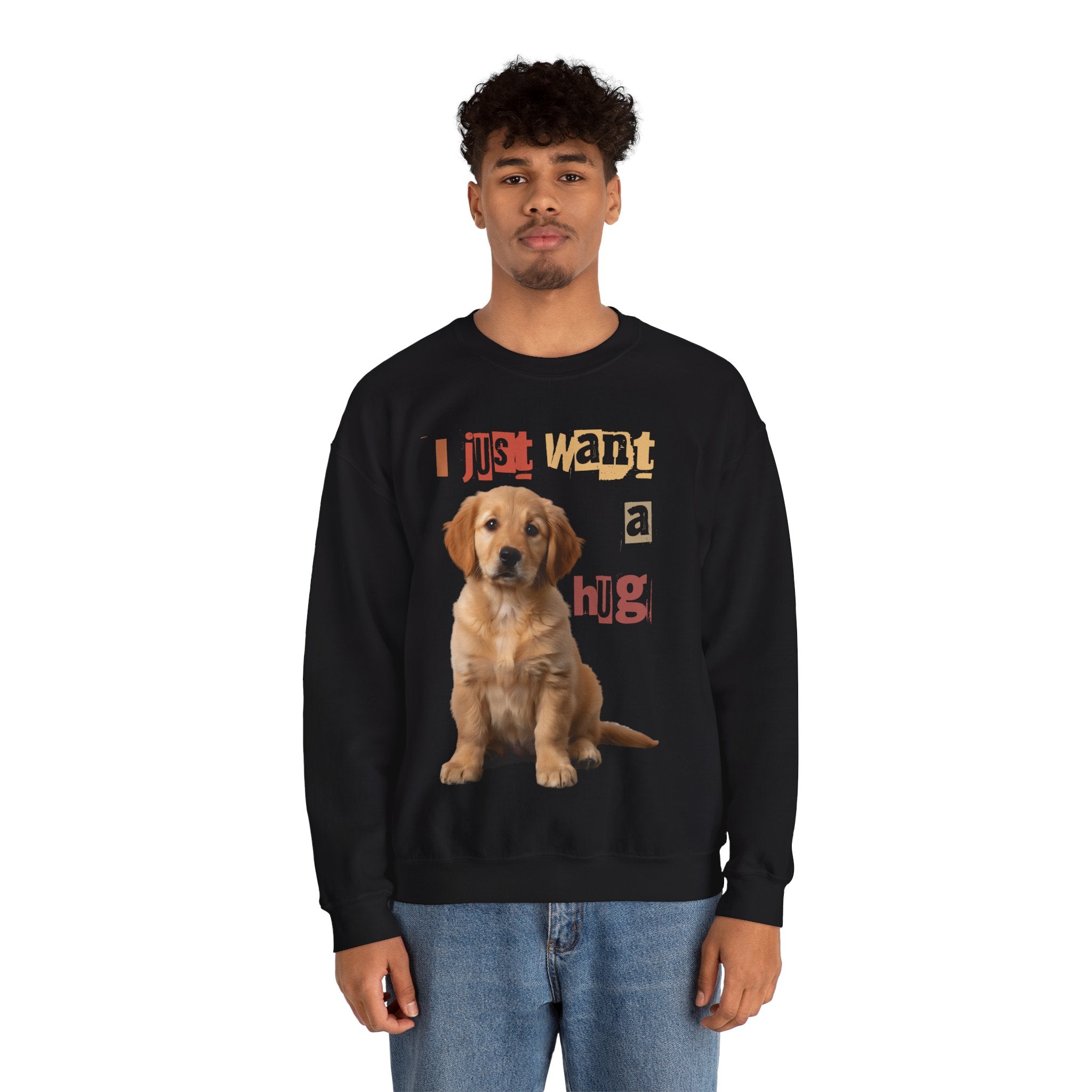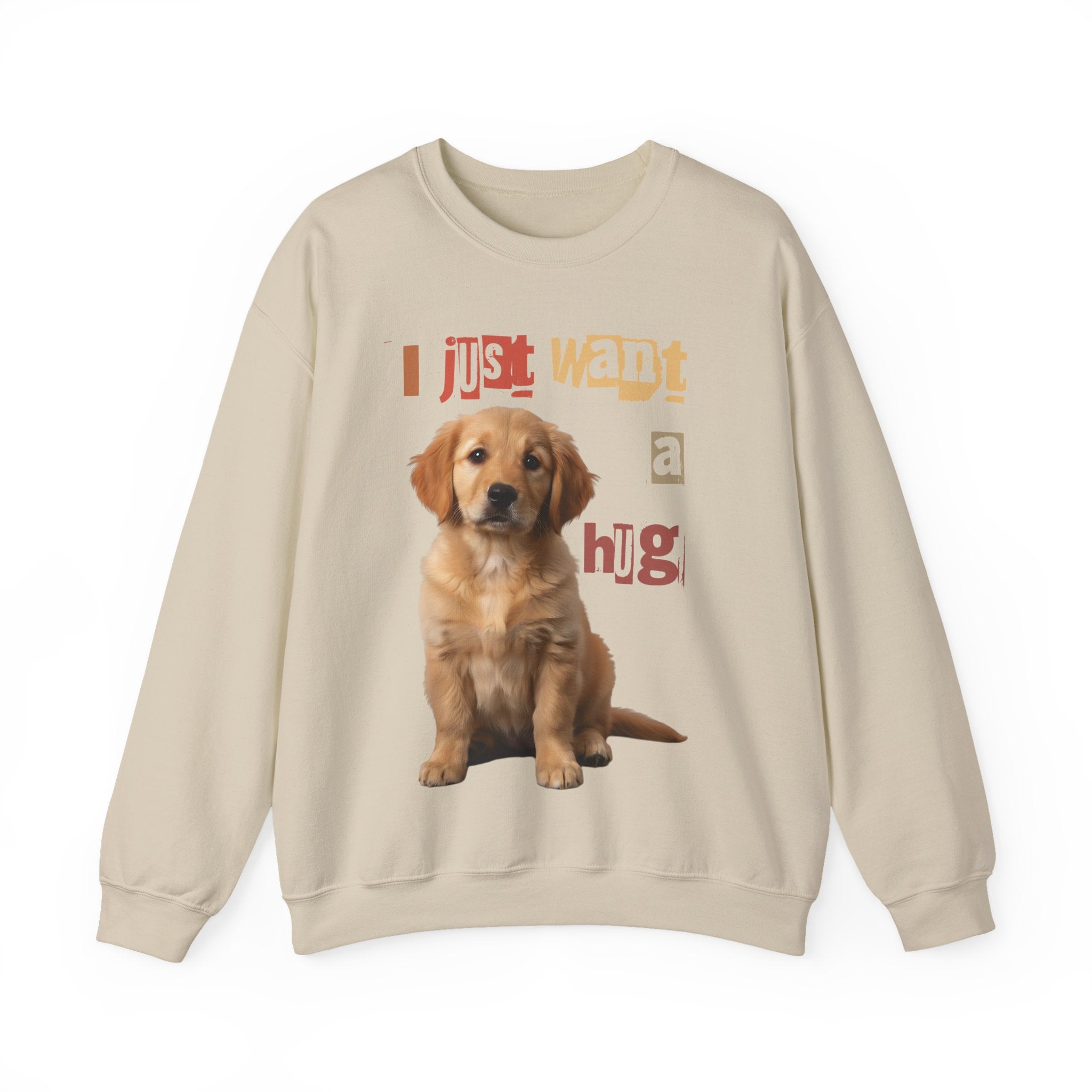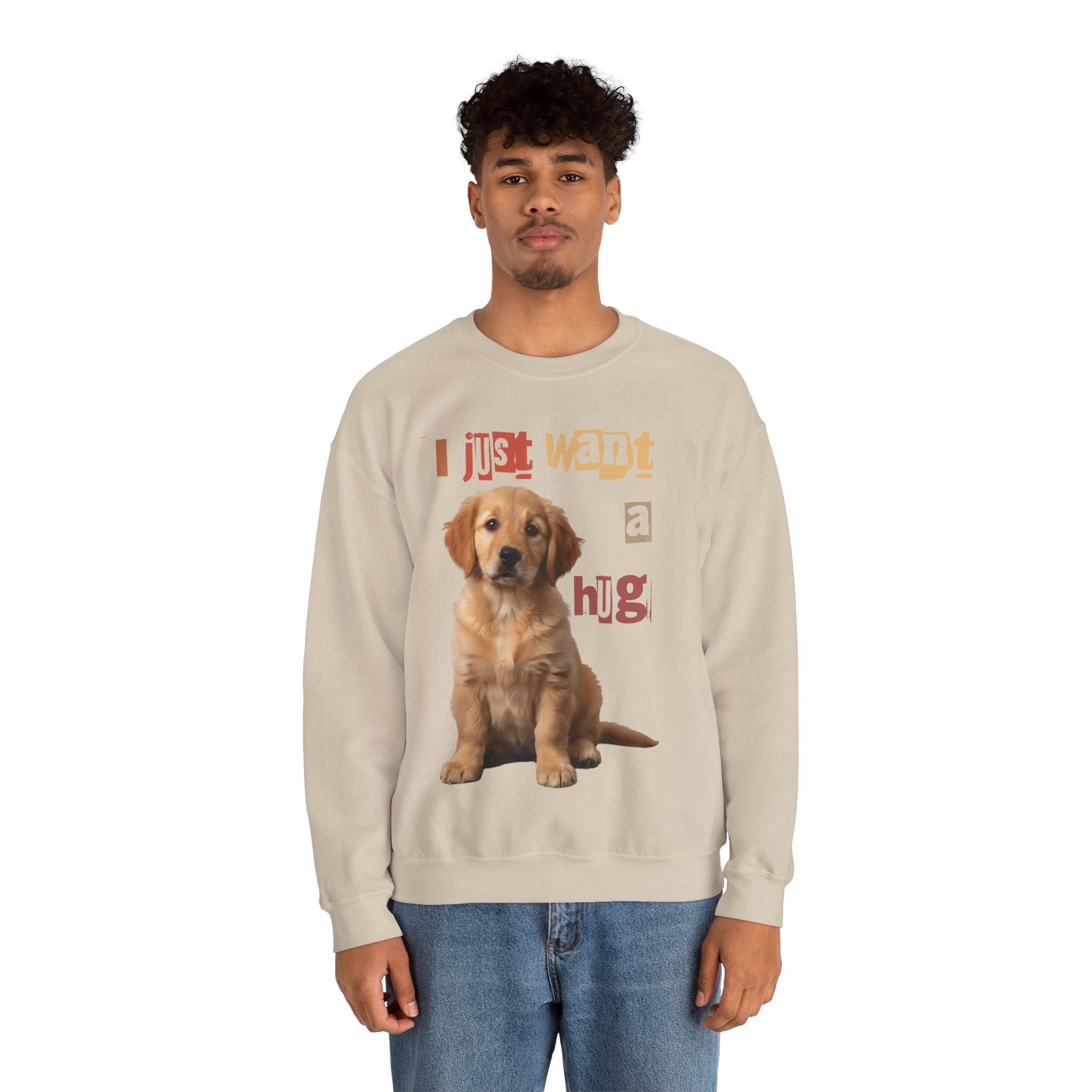 This cute Dog Hug Print Unisex Crewneck Sweatshirt brings a warm and playful vibe to your everyday wardrobe. Featuring a wide-eyed ginger dog with retro-style lettering that saysI just want a hug,this sweatshirt offers instant comfort and a touch of nostalgia. Crafted from a medium-heavy 50/50 cotton-poly blend, it ensures both comfort and durability. The ribbed collar, double-needle stitching, and tear-away neck label add to its quality. Perfect for layering on cool days or lounging around at home, this sweatshirt is ethically made cotton with OEKO-TEX certified dyes. Embrace cozy moments with this charming piece.
