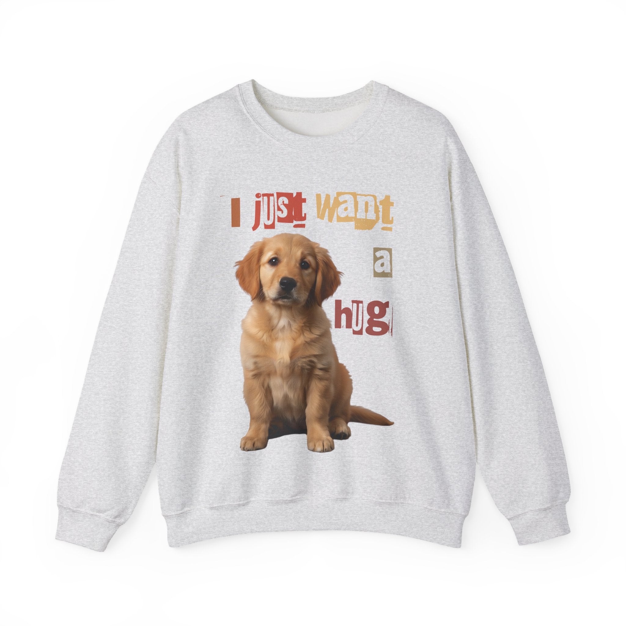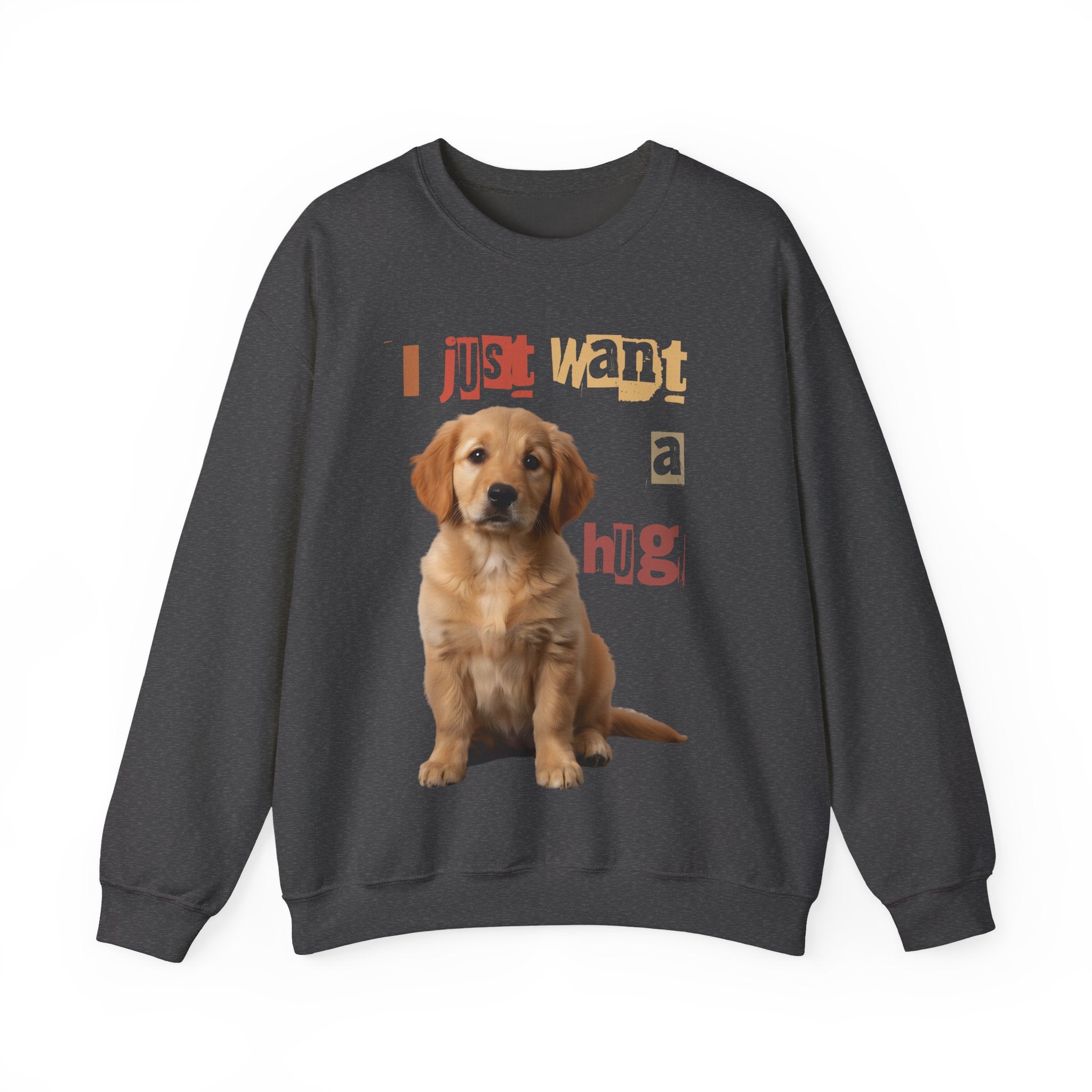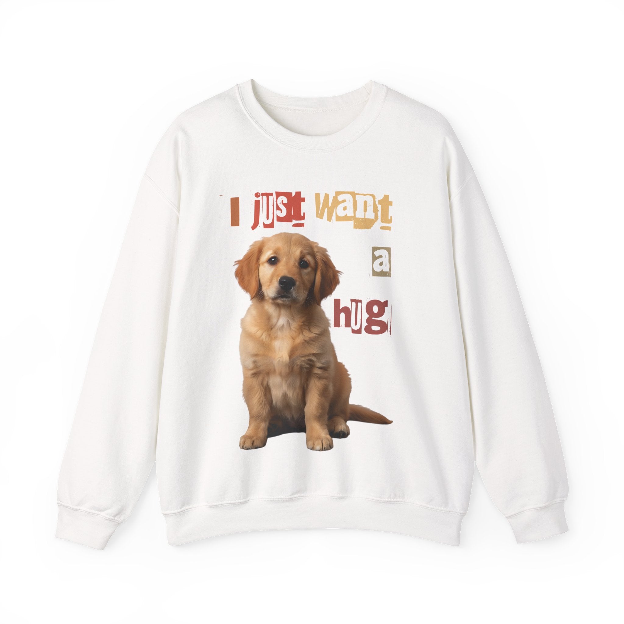 This cute Dog Hug Print Unisex Crewneck Sweatshirt brings a warm and playful vibe to your everyday wardrobe. Featuring a wide-eyed ginger dog with retro-style lettering that saysI just want a hug,this sweatshirt offers instant comfort and a touch of nostalgia. Crafted from a medium-heavy 50/50 cotton-poly blend, it ensures both comfort and durability. The ribbed collar, double-needle stitching, and tear-away neck label add to its quality. Perfect for layering on cool days or lounging around at home, this sweatshirt is ethically made cotton with OEKO-TEX certified dyes. Embrace cozy moments with this charming piece.