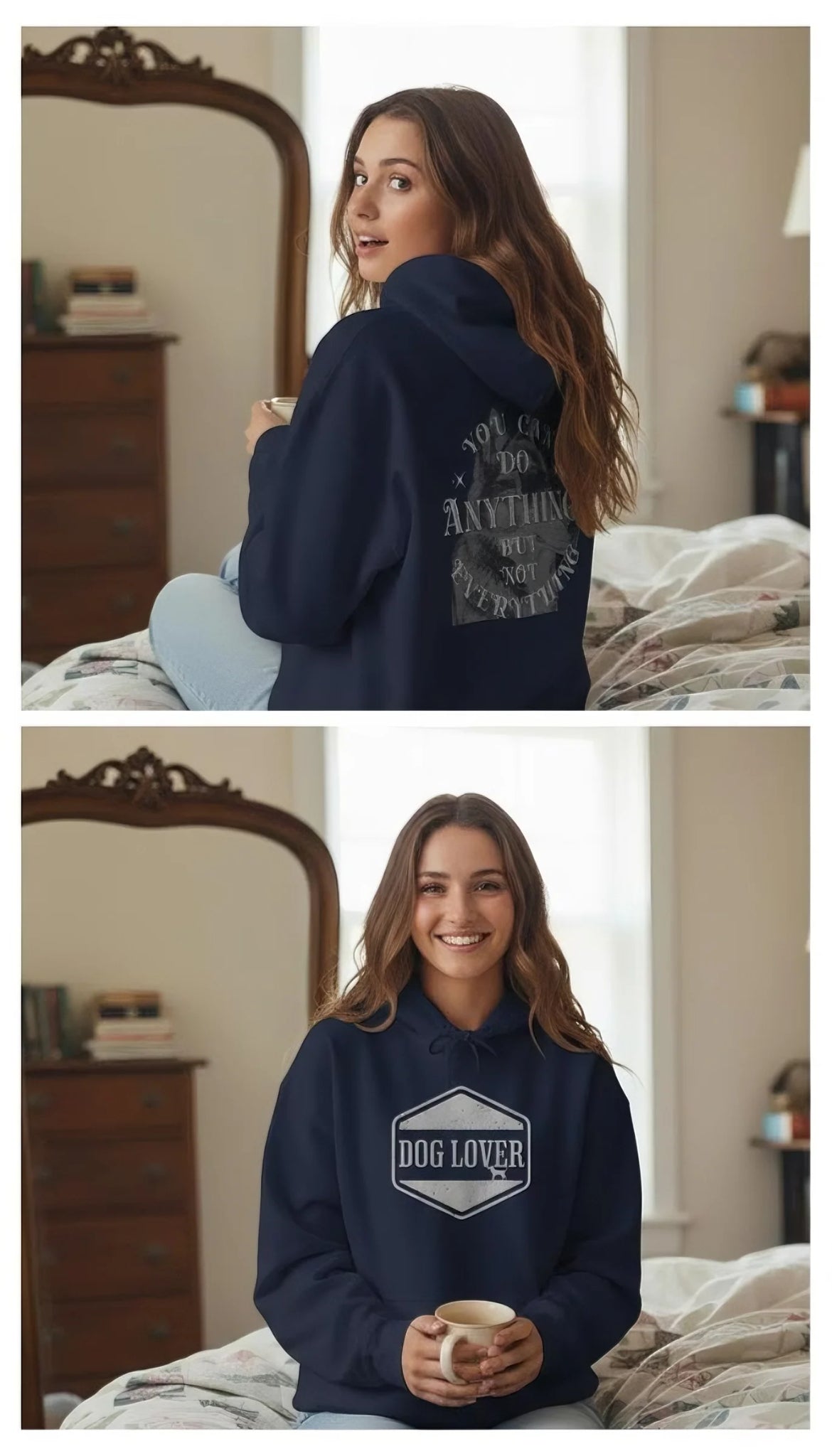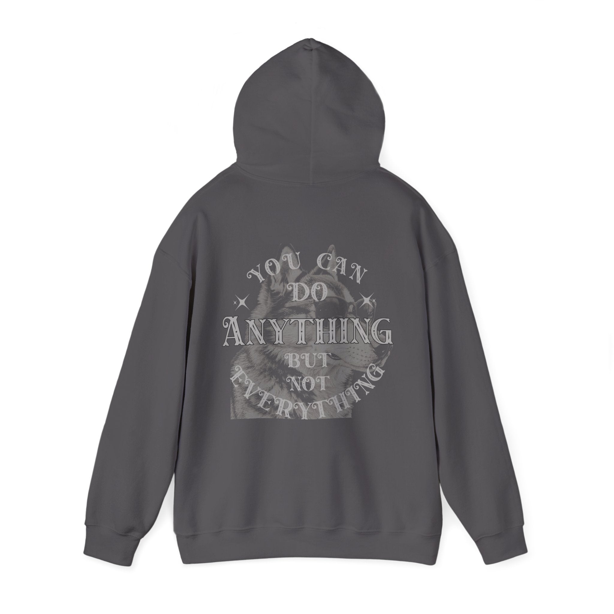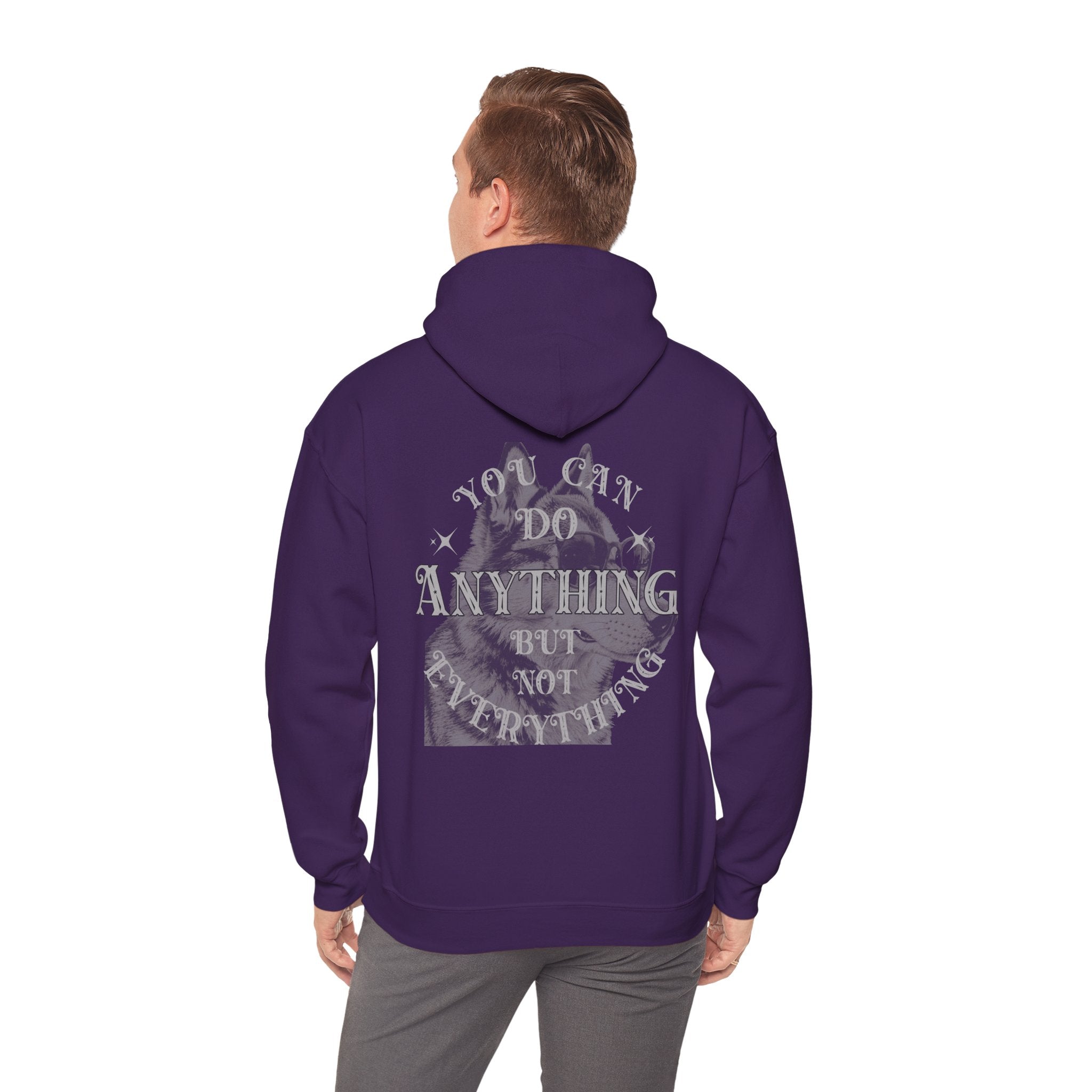 Stay cozy and celebrate your bond with dogs in this Dog Lover Slogan Back Fleece Hooded Sweatshirt. Made with a soft 50/50 cotton-poly blend, this mid-weight hoodie features a vintage-style badge on the front and an inspiring graphic with the wordsYou can do anything but not everythingon the back. The kangaroo pocket, double-lined hood, and color-matched drawcord offer practicality and style. Perfect for outings to the dog park or relaxing at home with your furry friend, this hoodie serves as a comforting reminder to focus on what truly matters. Available in a variety of sizes and colors to suit your style.