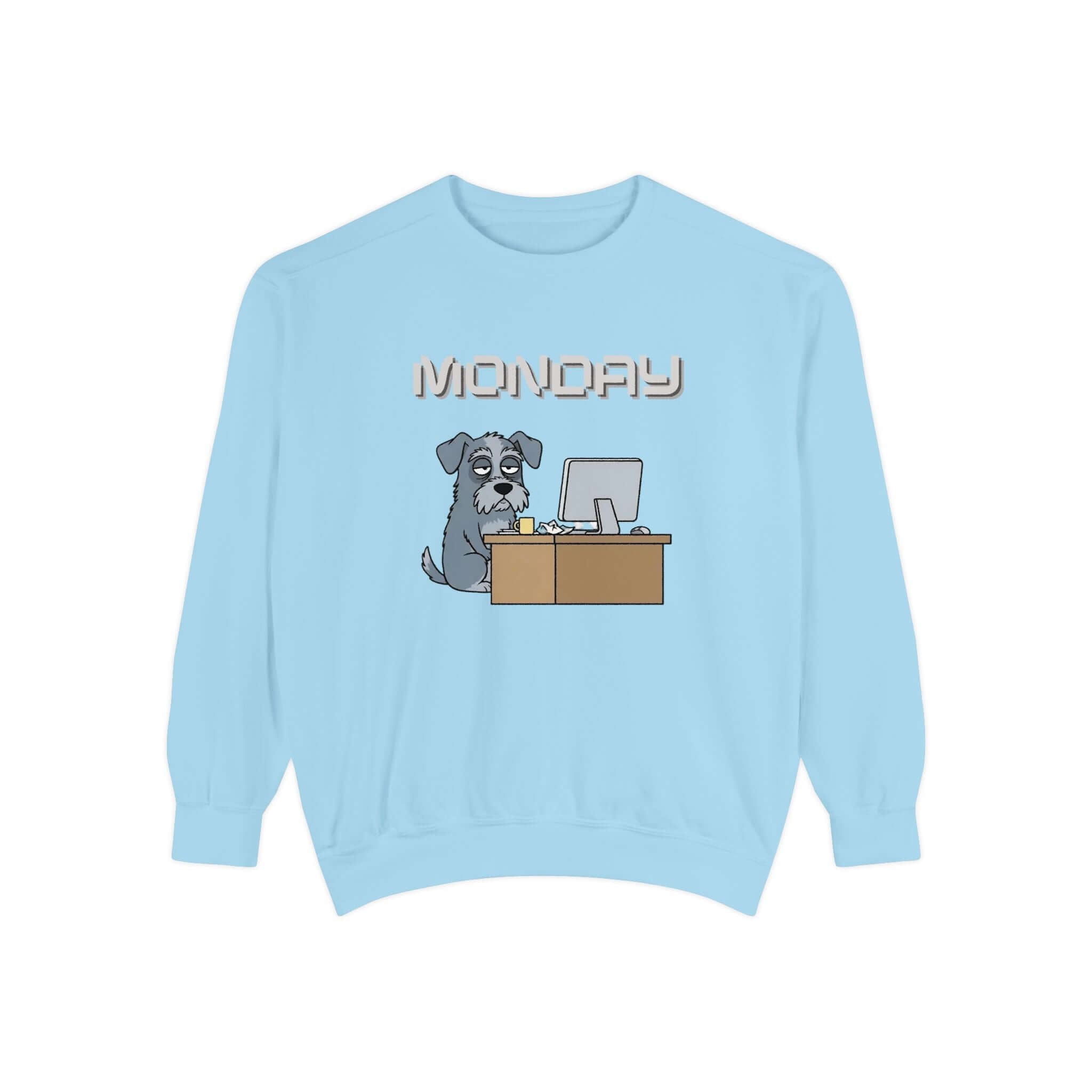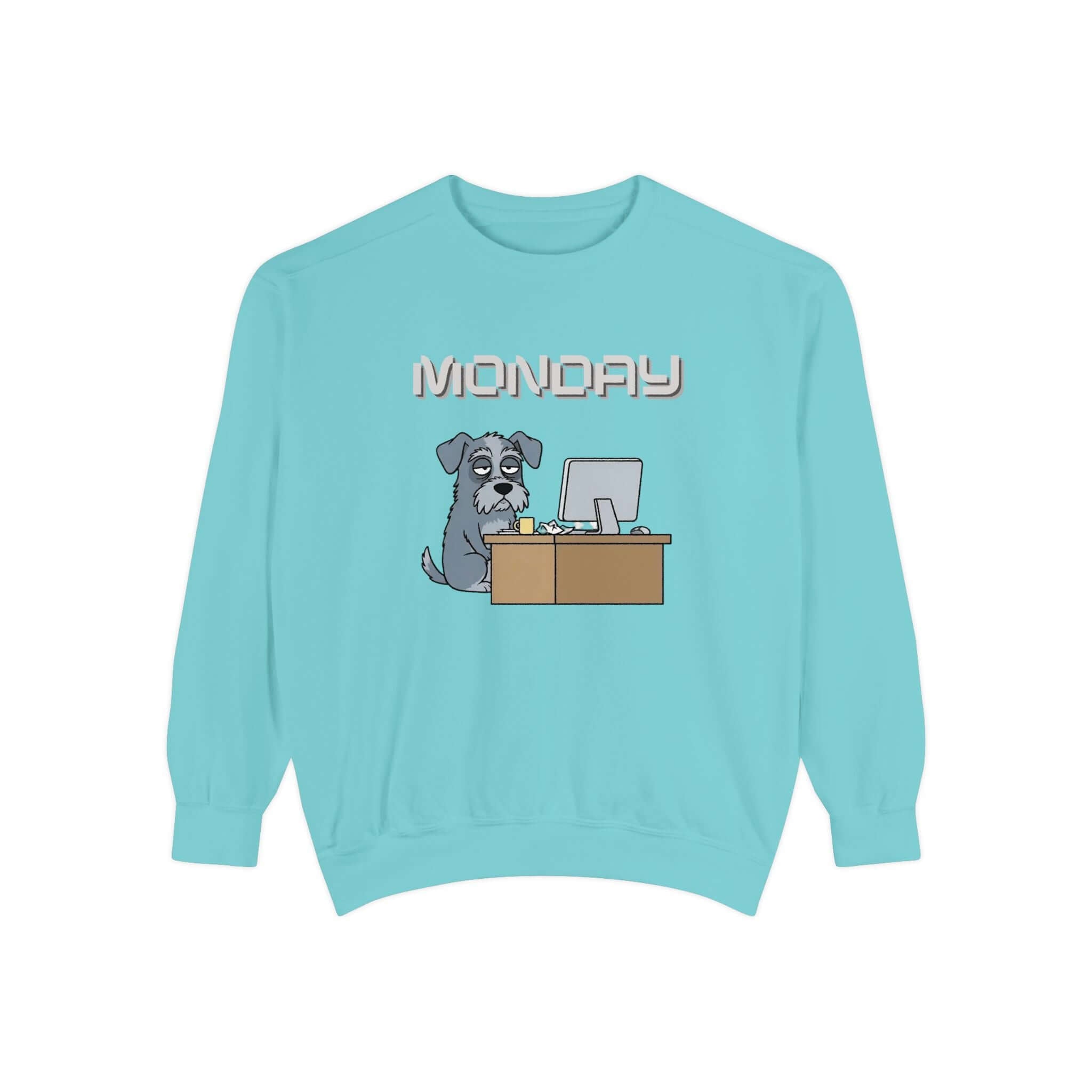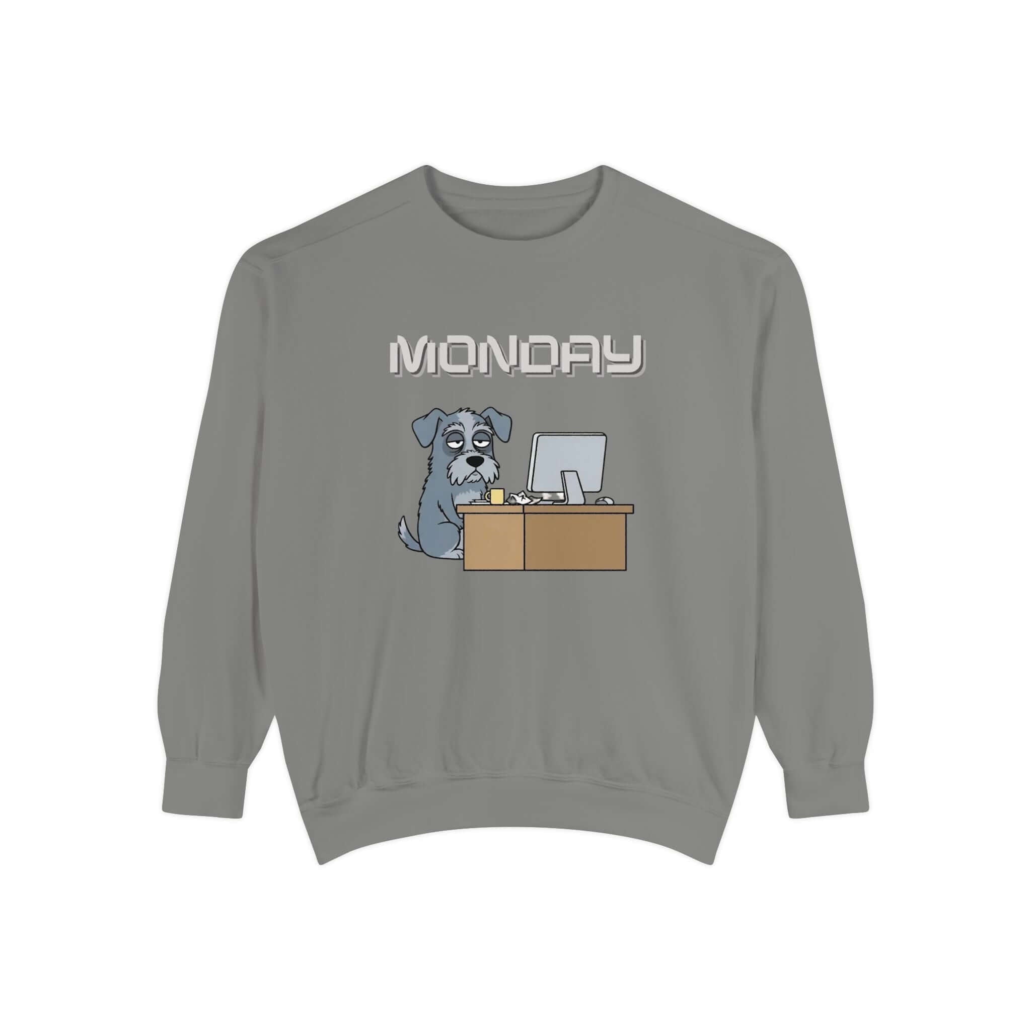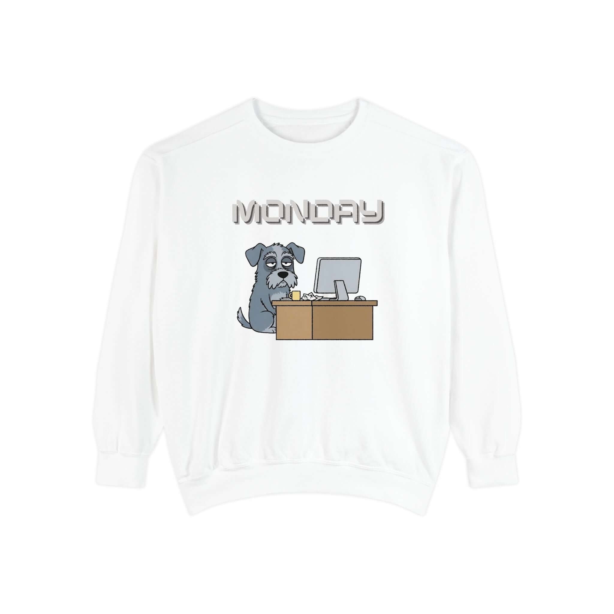 Stay cozy in style with our Dog Print Monday Face Unisex Crewneck Sweatshirt style 2. Featuring a relaxed fit and medium-heavy ring-spun cotton blend, this sweatshirt offers both comfort and quality. The stamped “MONDAY” banner with a grumpy and resigned dog adds a touch of humor to your wardrobe. Whether you wear it for coffee runs, lounging at home, or casual outings, this sweatshirt is sure to keep you comfortable. It also includes ribbed collar and cuffs, twill neck tape, and OEKO-TEX dyed colors for a premium feel. This sweatshirt is machine washable and built to last.
