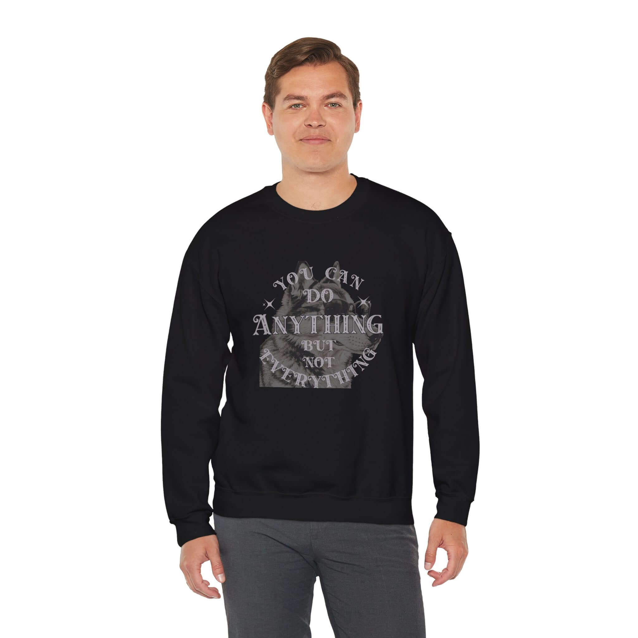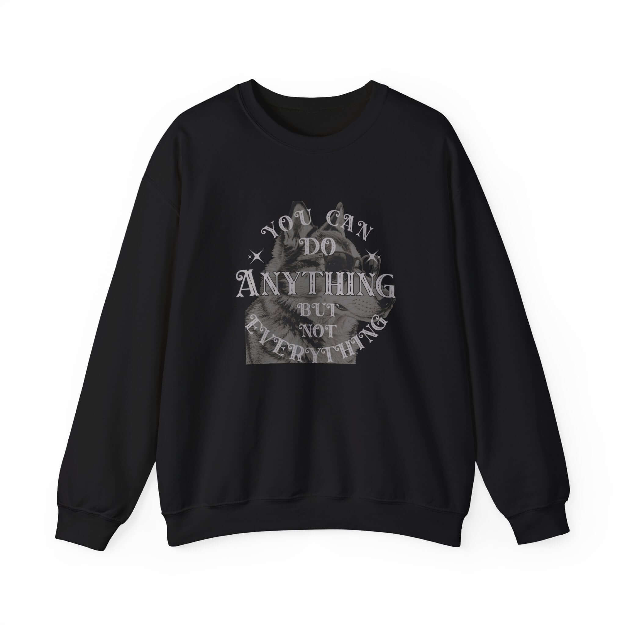Discover motivation and comfort with our Motivational Dog Graphic Crewneck Sweatshirt. This Unisex Sweatshirt features a charming dog illustration and the inspiring quote “You can do anything but not everything.” Made from soft, durable fabric, this stylish sweatshirt is perfect for dog lovers seeking expressive and meaningful apparel. Whether youre out and about, unwinding at home, or creating a casual streetwear ensemble, this sweatshirt offers all-day comfort. The unique dog design adds a touch of charm, while the motivational message keeps you uplifted. Its an ideal gift for dog owners, pet enthusiasts, or anyone who enjoys fun yet empowering clothing. Elevate your wardrobe with our cool dog graphic sweatshirt, blending comfort and creativity effortlessly. Available in sizes S to 3XL.